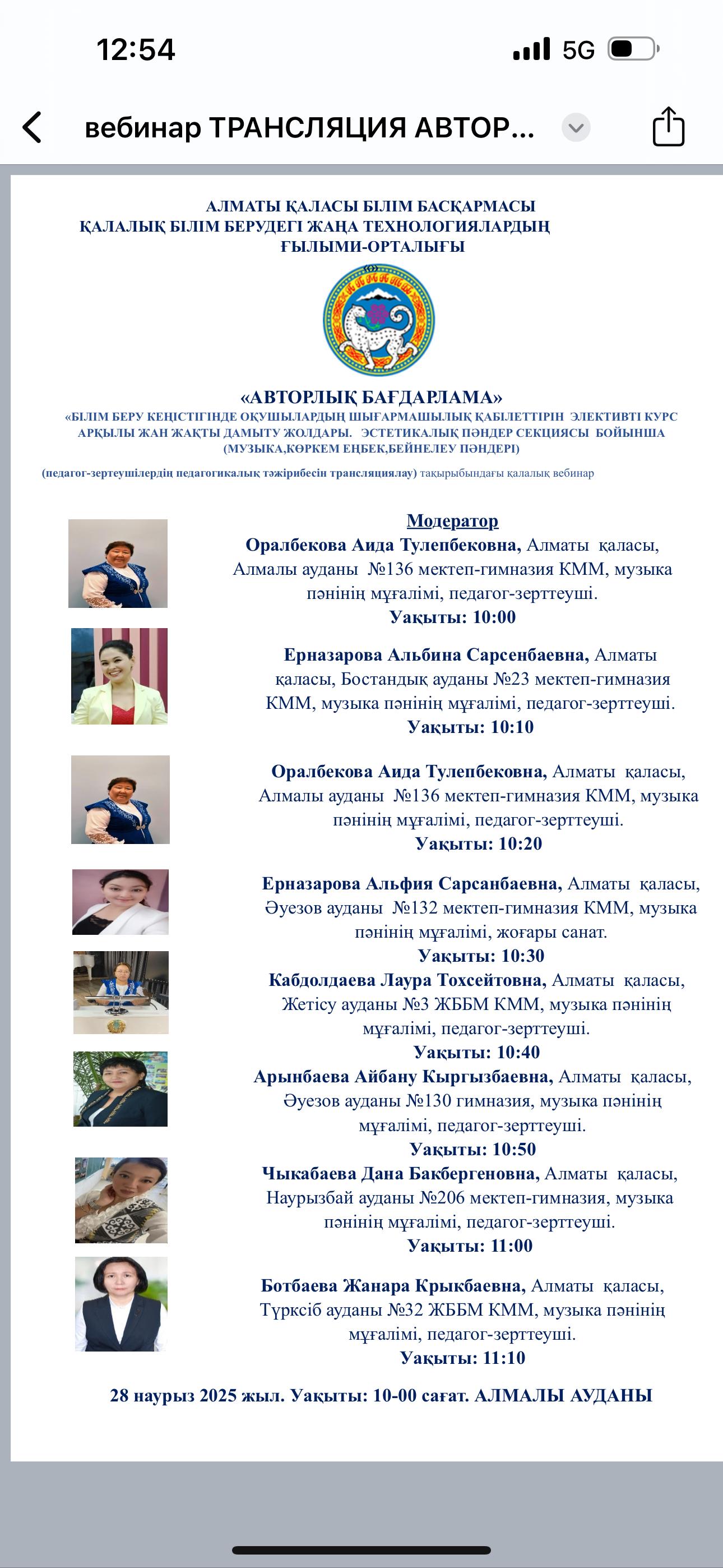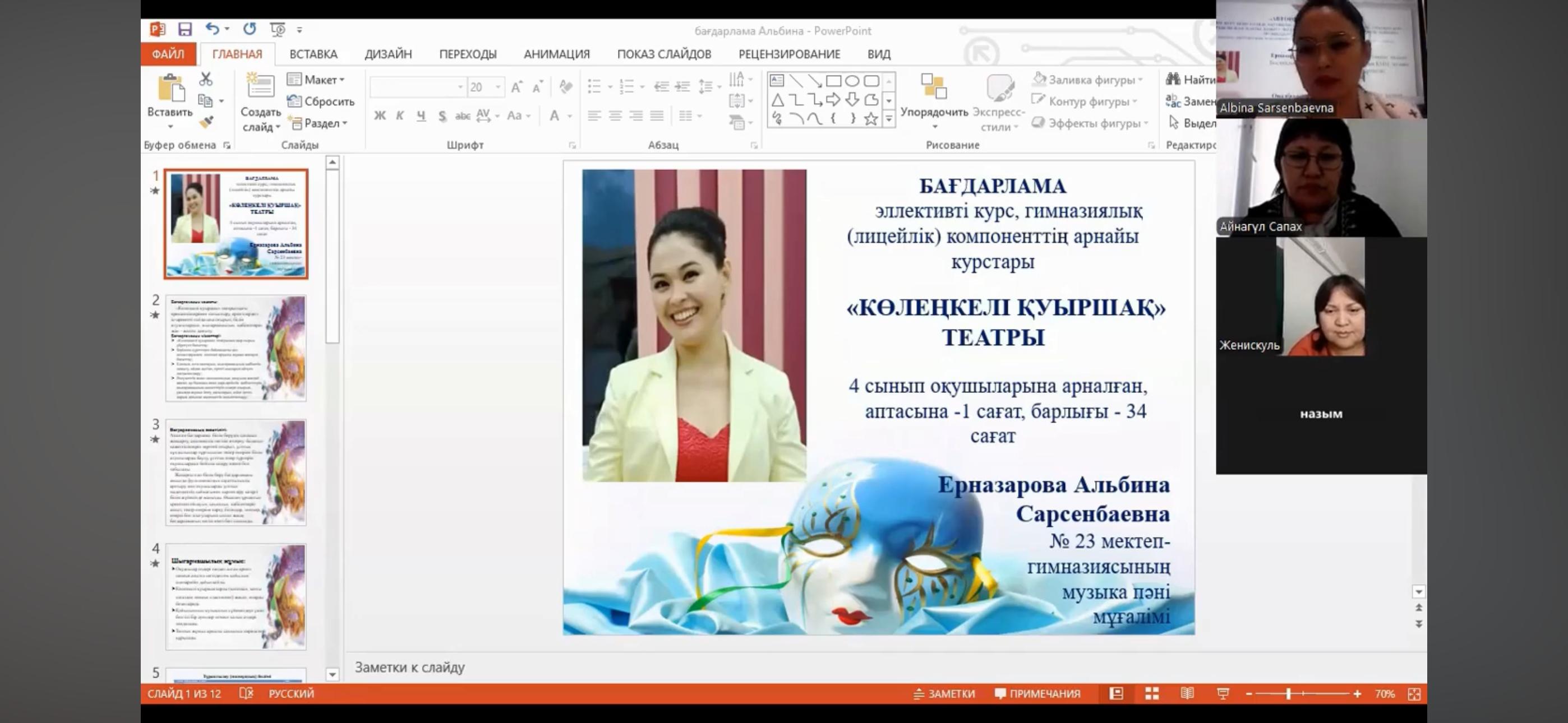 28 марта 2025 года в школе-гимназии №136 Алмалинского района города Алматы прошёл вебинар на тему: «Развитие творческих способностей учащихся через элективный курс в образовательном пространстве. Секция эстетических предметов (музыка, трудовое обучение, изобразительное искусство). Трансляция педагогического опыта педагогов-исследователей».