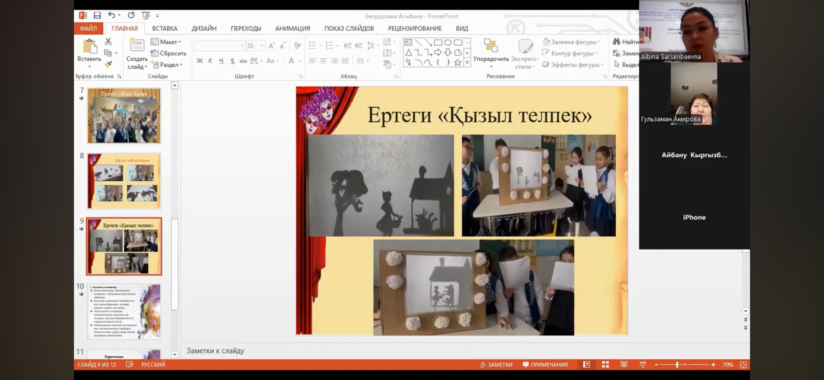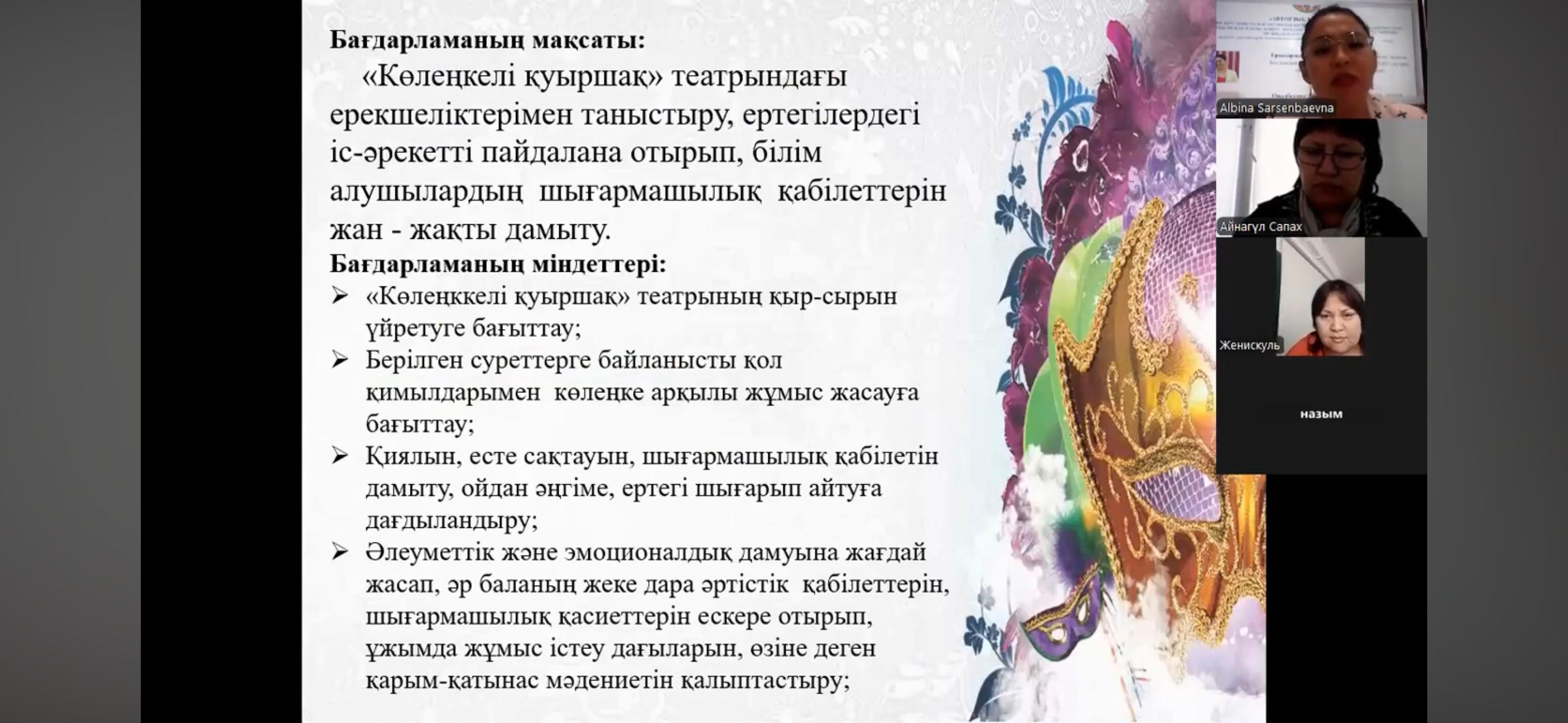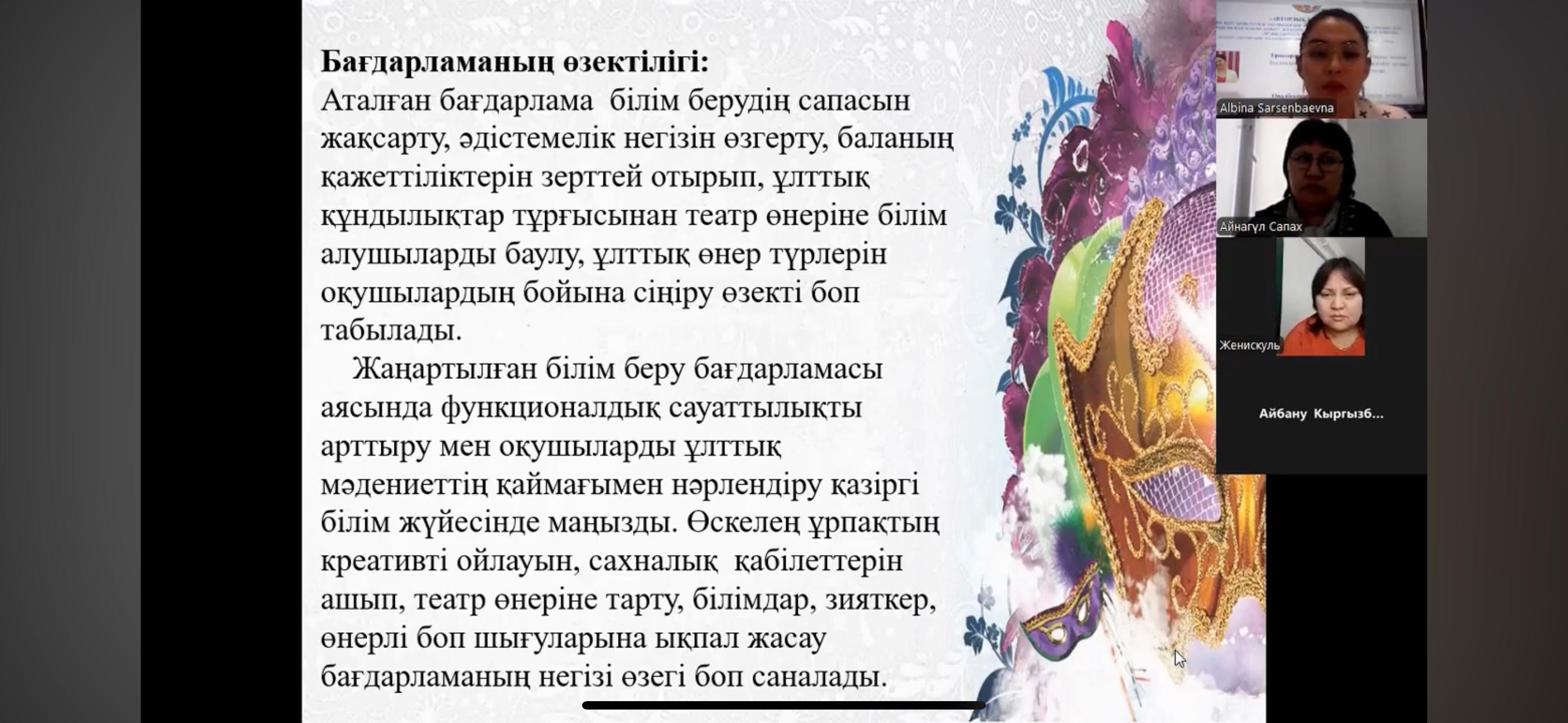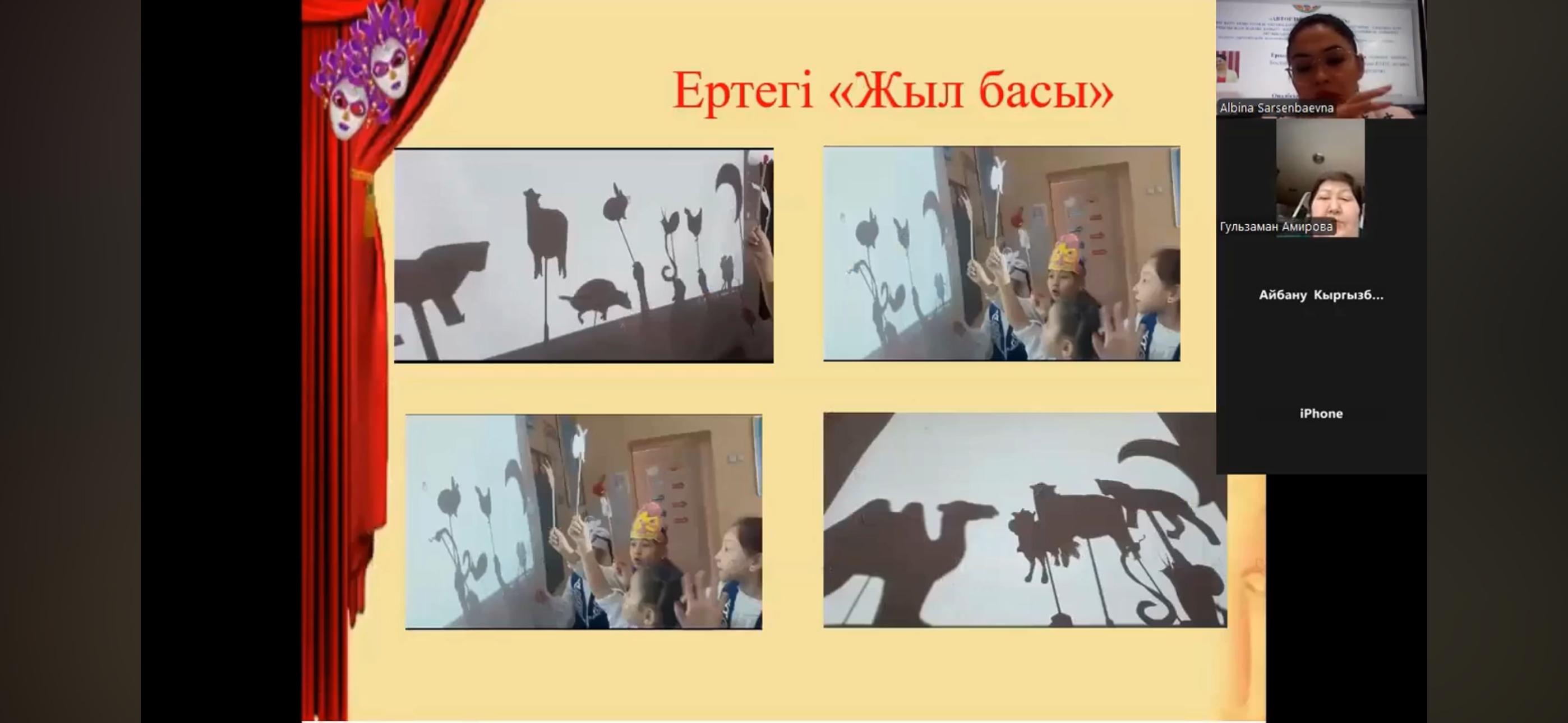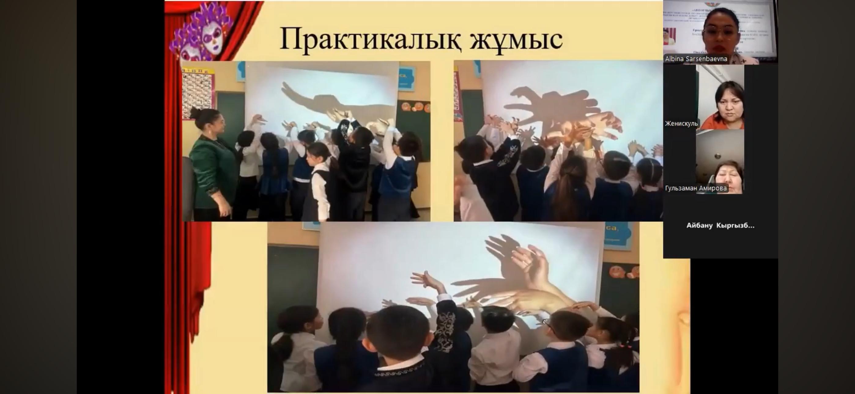 Вебинар собрал учителей музыки из районов Алмалинский, Ауэзовский, Бостандыкский, Жетысуский, Наурызбайский и Турксибский города Алматы, где участники делились своим опытом. Учитель музыки «Школа – гимназии № 23» Бостандыкского района, педагог - исследователь — Ерназарова Альбина Сарсенбаевна — представила программу элективного курса на тему «Көлеңкелі қуыршақ» театры и поделилась своим опытом с коллегами города Алматы.