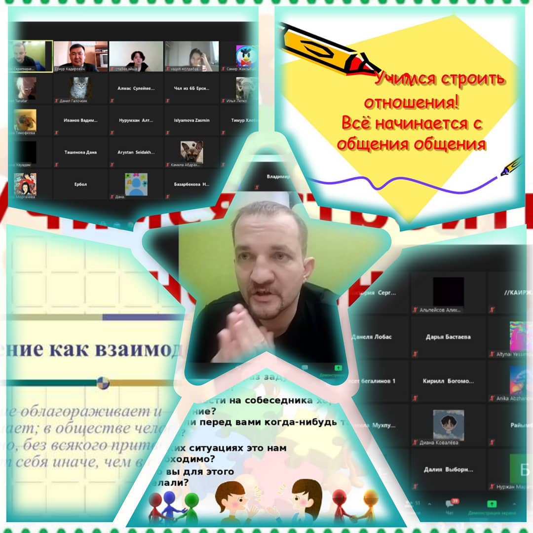 Онлайн встреча с учащимися 6 классов на тему: «Учимся строить отношения», согласно плану ВШК на основании «Национального и семейного» направления ВР. Гость программы – основатель подросткового центра «TeenAge», Скрипниченко Максим Александрович @teenage.kz