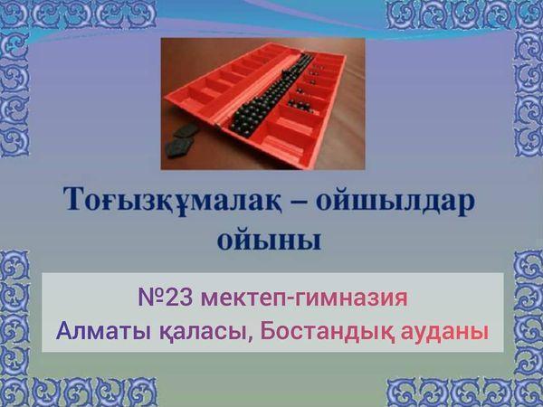 Қазақстан Республикасының Тәуелсіздігіне 30 жыл толуына орай, оқушылардың ұлттық спортқа деген қызығушылықтарын арттыру және өз денсаулықтарына ықтиярлықпен қарауға баулу мақсатында #23мектепгимназияалматы базасында онлайн форматта ұлттық ойынның бір түрі - Тоғызқұмалақ ойынынан жарыс өткізілді. Жарысты ұйымдастырушы - "Денешынықтыру" әдістемелік бірлестігі.
