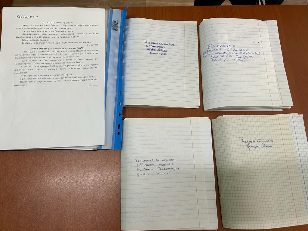 №23 мектеп-гимназиясының 4-6 сынып оқушылары арасында қызылша ауруының алдын алу шараларына байланысты «Қызылша және оның алдын алу» (КОРЬ) тақырыбында диктанттар жазды. Оқушылар бұл жедел тарайтын вирусты ауру туралы кеңірек біліп, одан сақтану жолдарын, әртүрлі вирустарға қарсы тұру үшін иммунитетін көтеру үшін не істеу керек екендігінен хабардар болды.