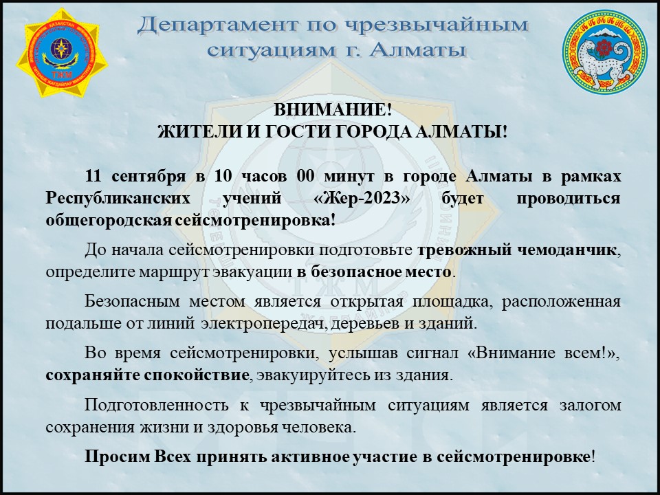 Бүгін "№23 мектеп-гимназия" КММ-де мектеп оқушылары мен қызметкерлерінің қатысуымен сейсмикалық жаттығулары өткізілді. Іс-шараның мақсаты: Азаматтық қорғаныстың маңыздылығына әлемдік жұртшылықтың назарын аудару, табиғи және техногендік сипаттағы төтенше жағдайлар кезінде халықтың өзін-өзі қорғауға дайындығын пысықтау.