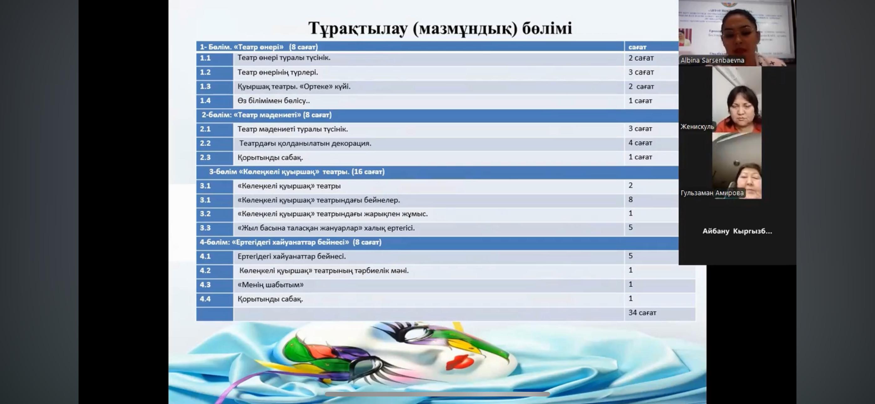 Вебинар собрал учителей музыки из районов Алмалинский, Ауэзовский, Бостандыкский, Жетысуский, Наурызбайский и Турксибский города Алматы, где участники делились своим опытом. Учитель музыки «Школа – гимназии № 23» Бостандыкского района, педагог - исследователь — Ерназарова Альбина Сарсенбаевна — представила программу элективного курса на тему «Көлеңкелі қуыршақ» театры и поделилась своим опытом с коллегами города Алматы.