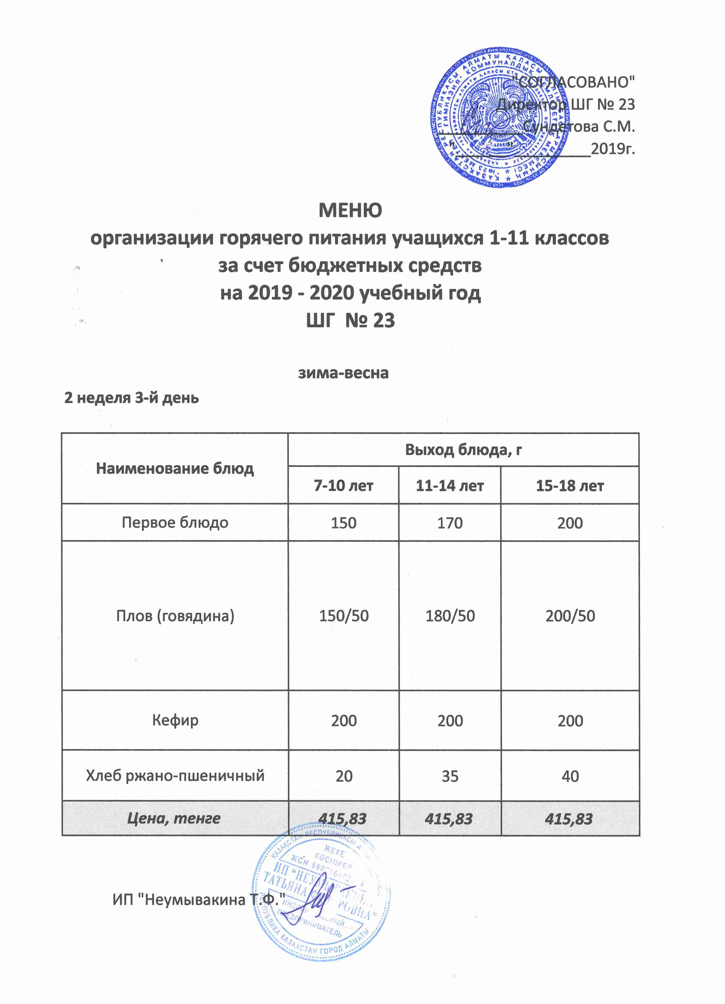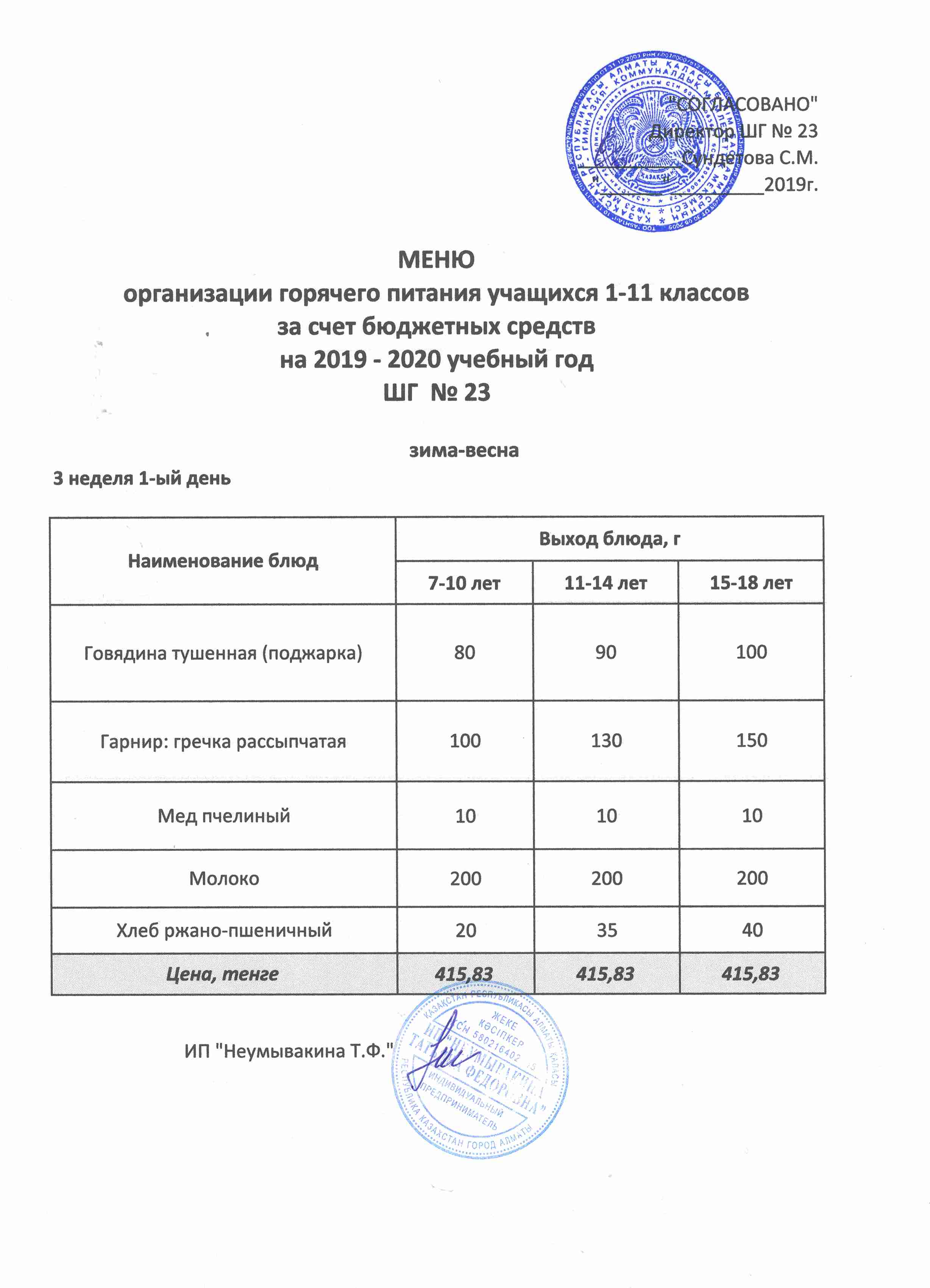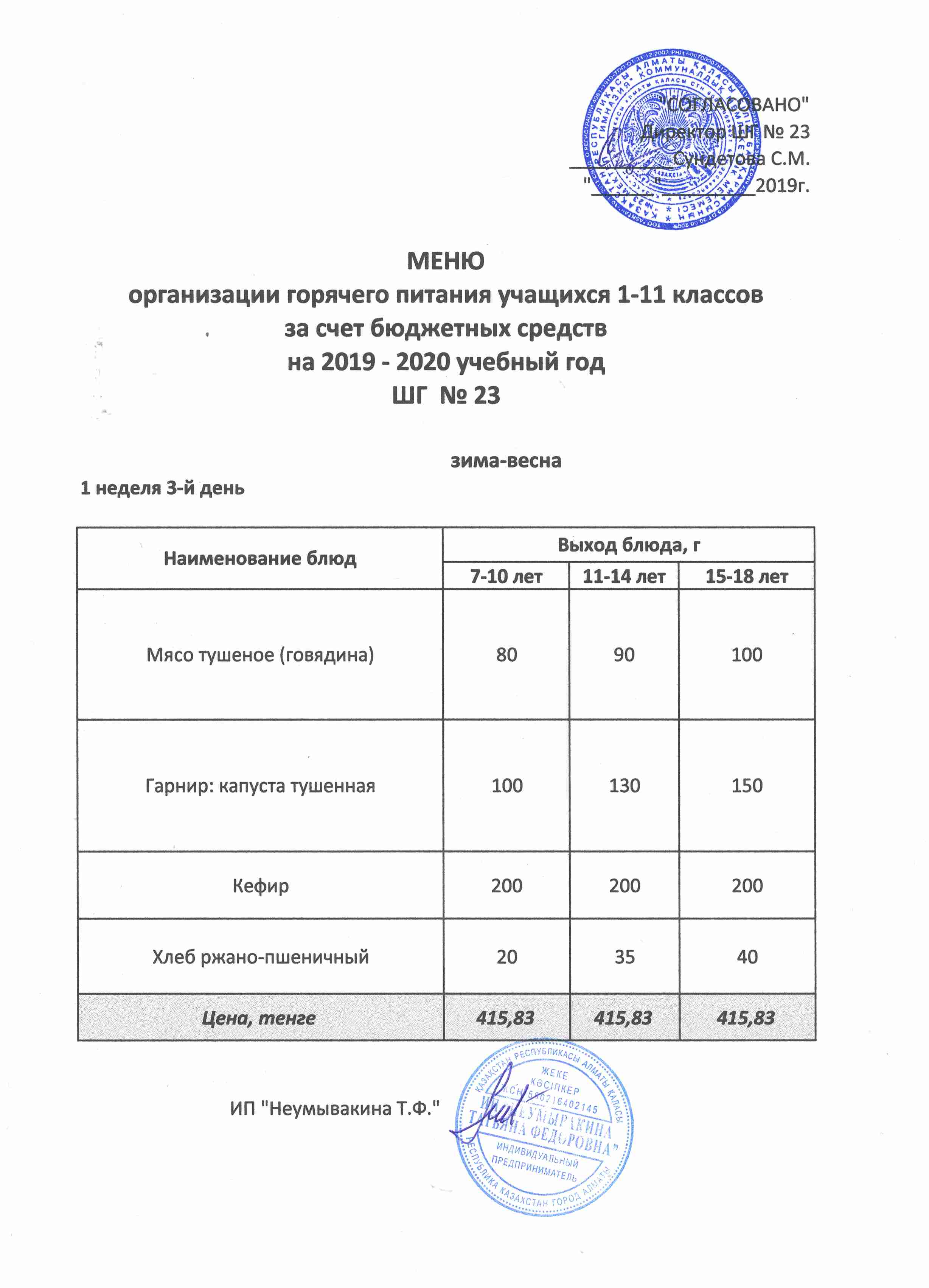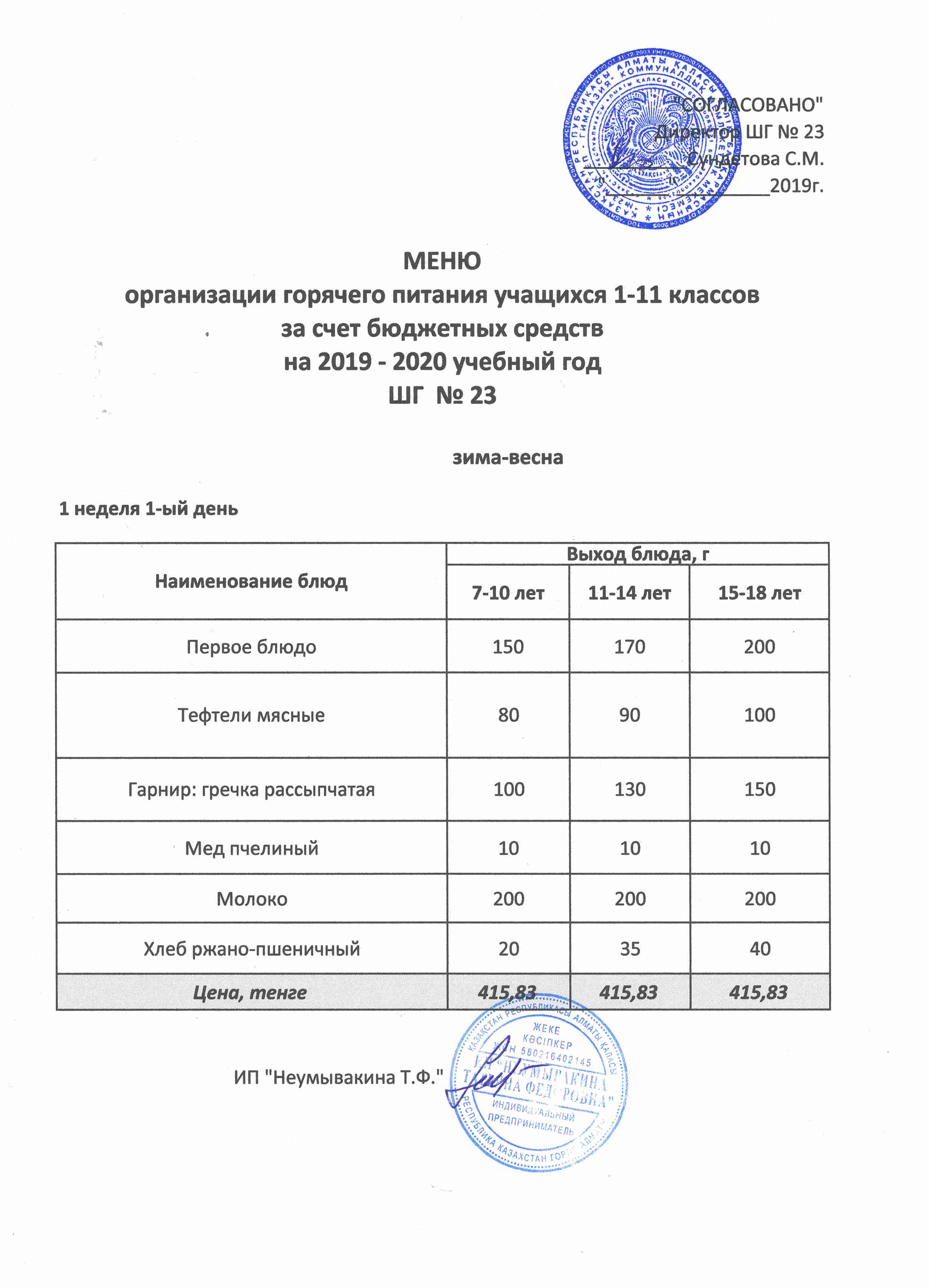 Меню организации горячего питания учащихся 1-11 классов за счет бюджетных средств на 2019 учебный год