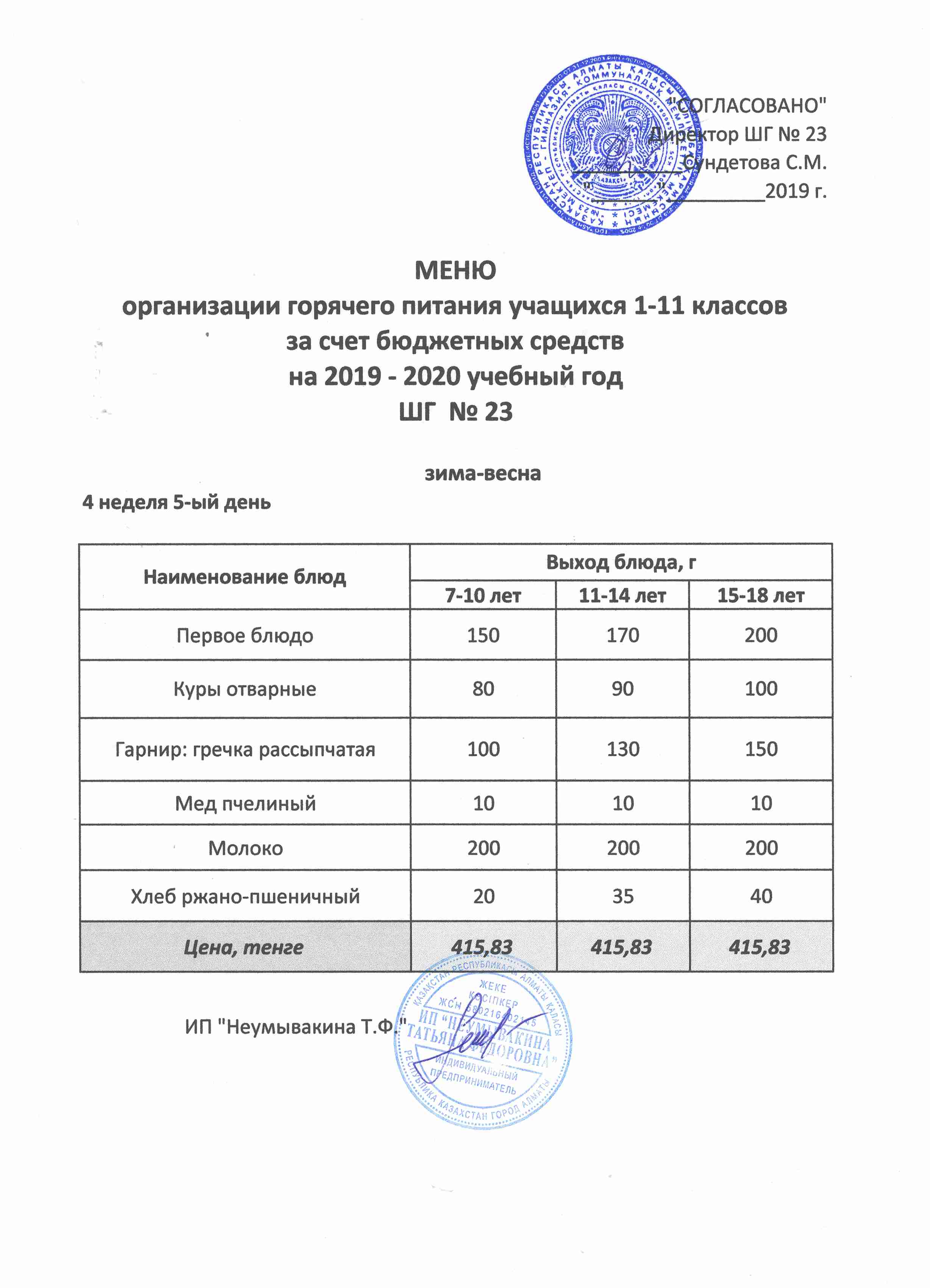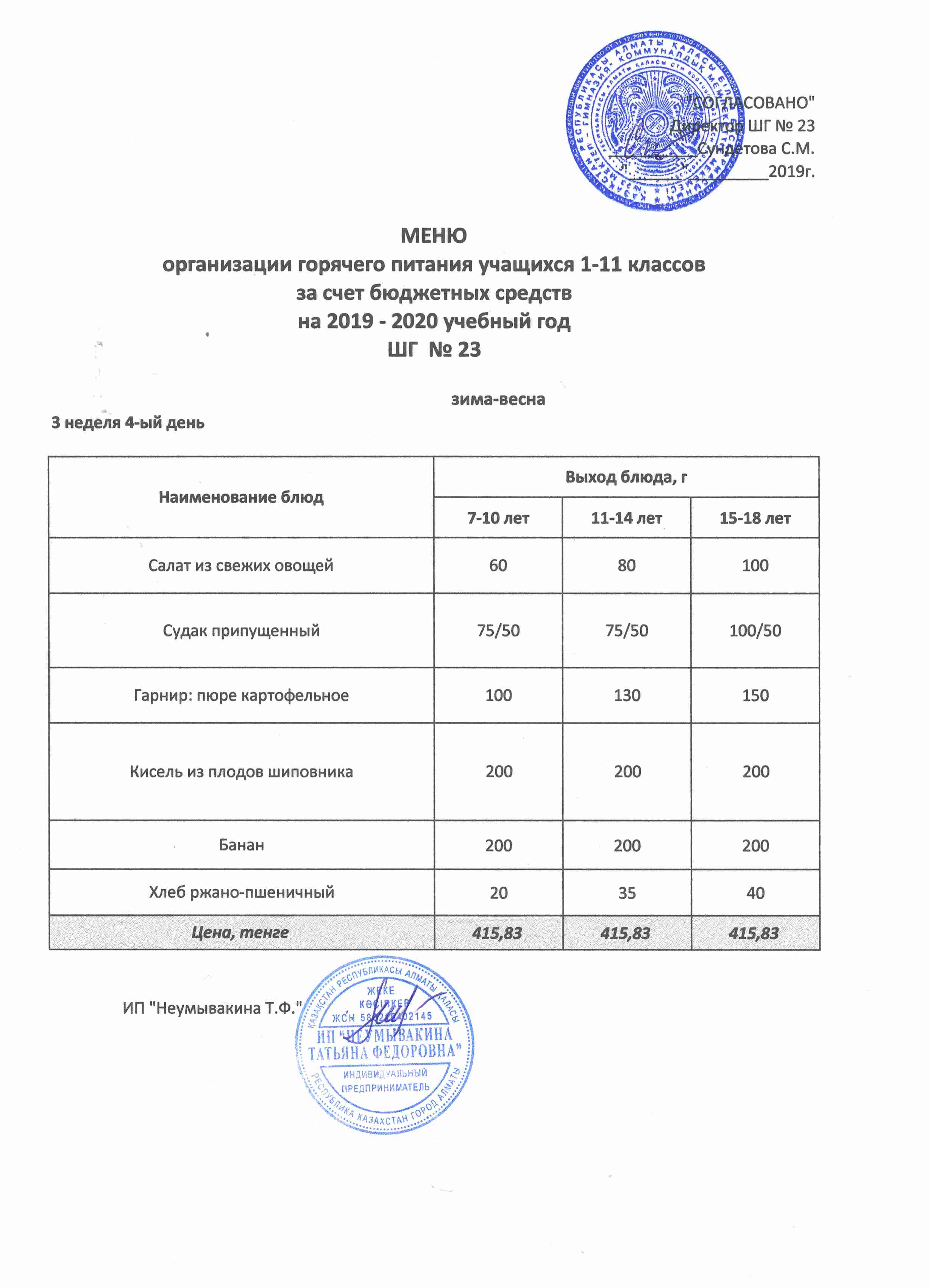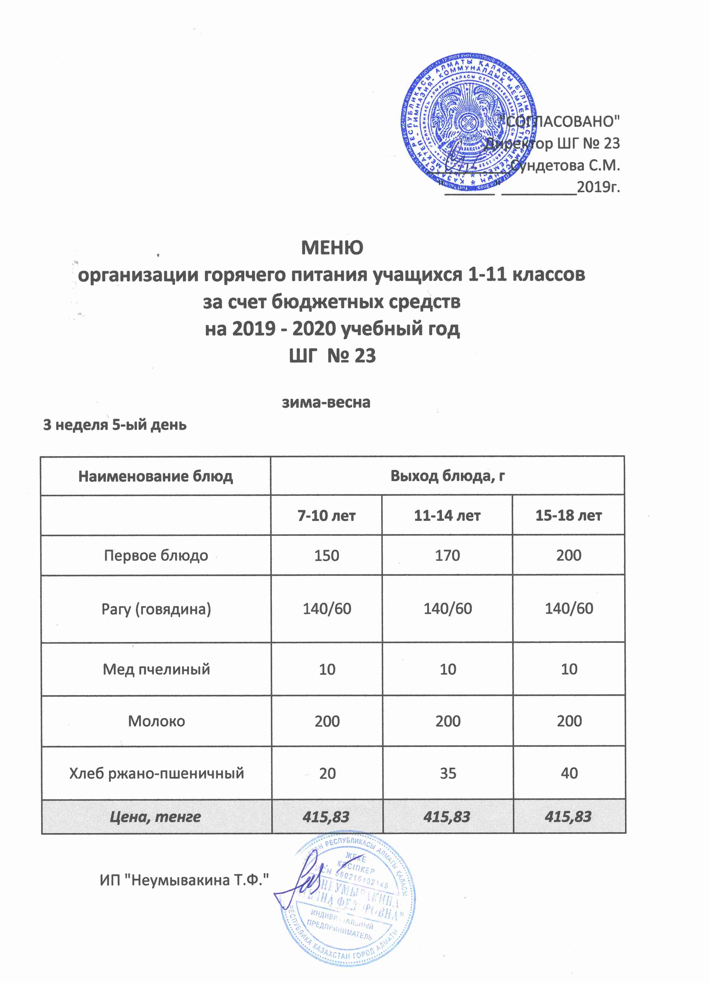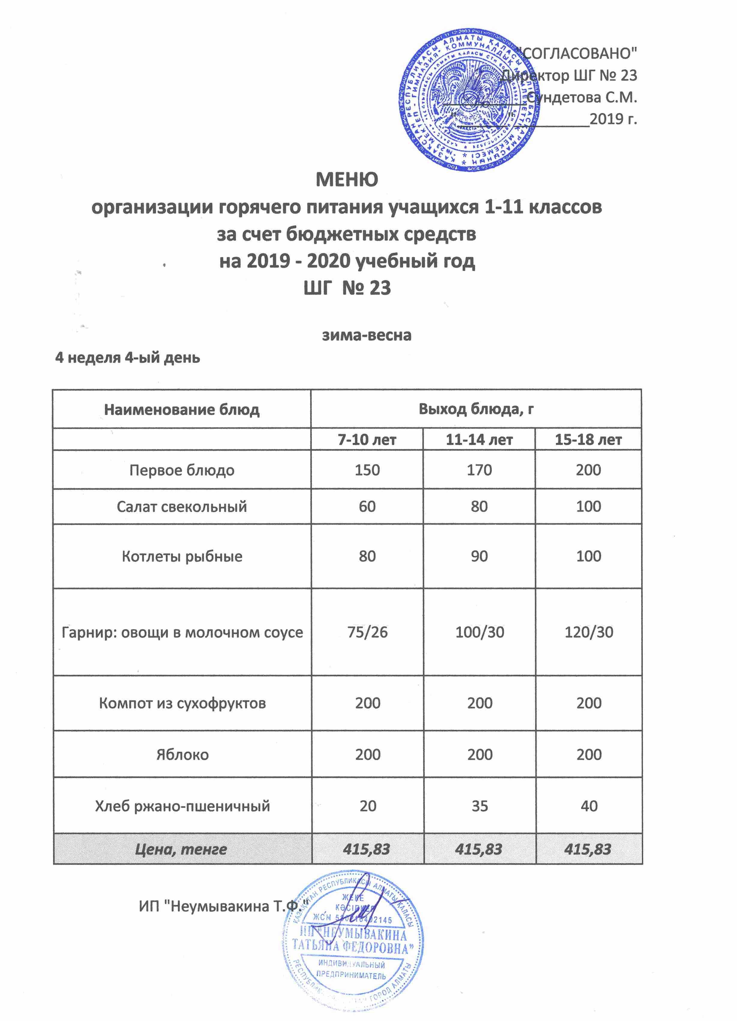 Меню организации горячего питания учащихся 1-11 классов за счет бюджетных средств на 2019 учебный год