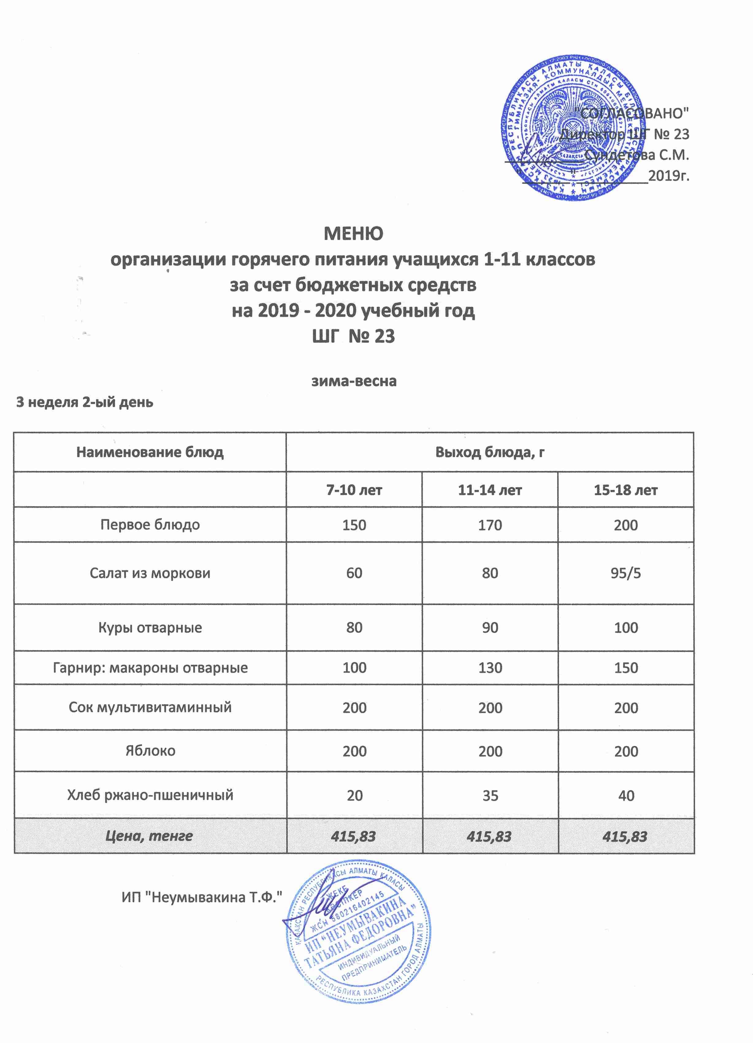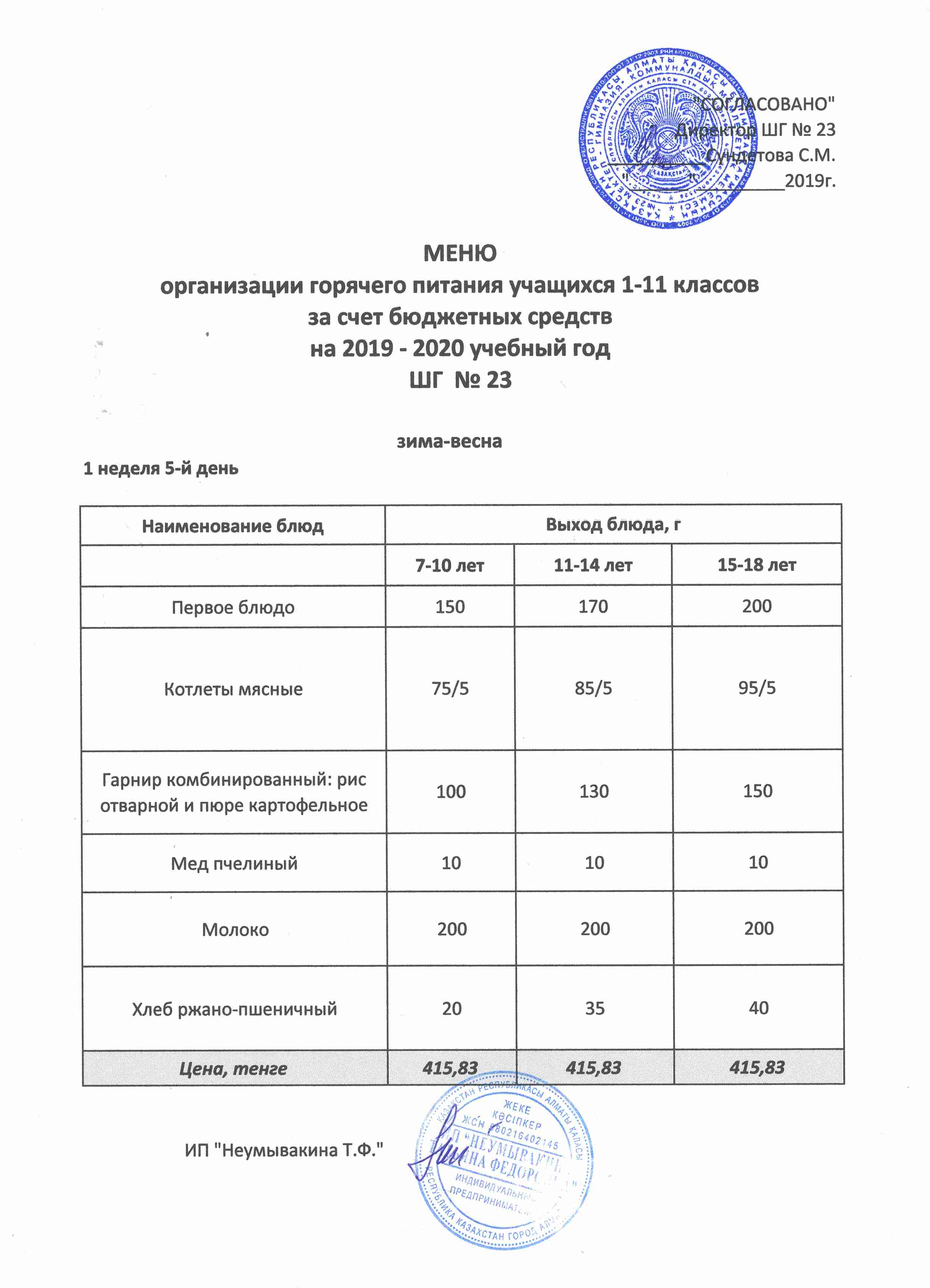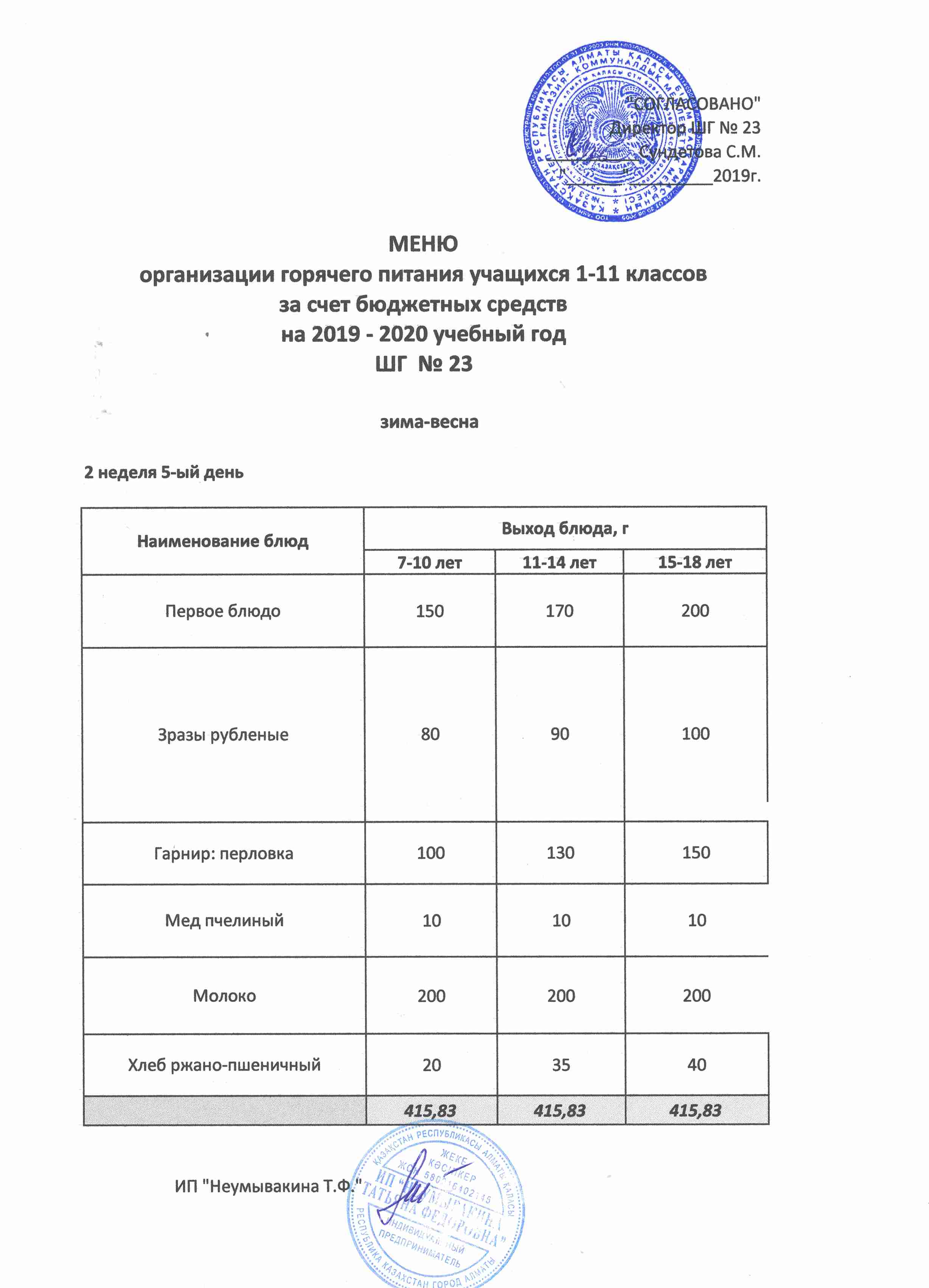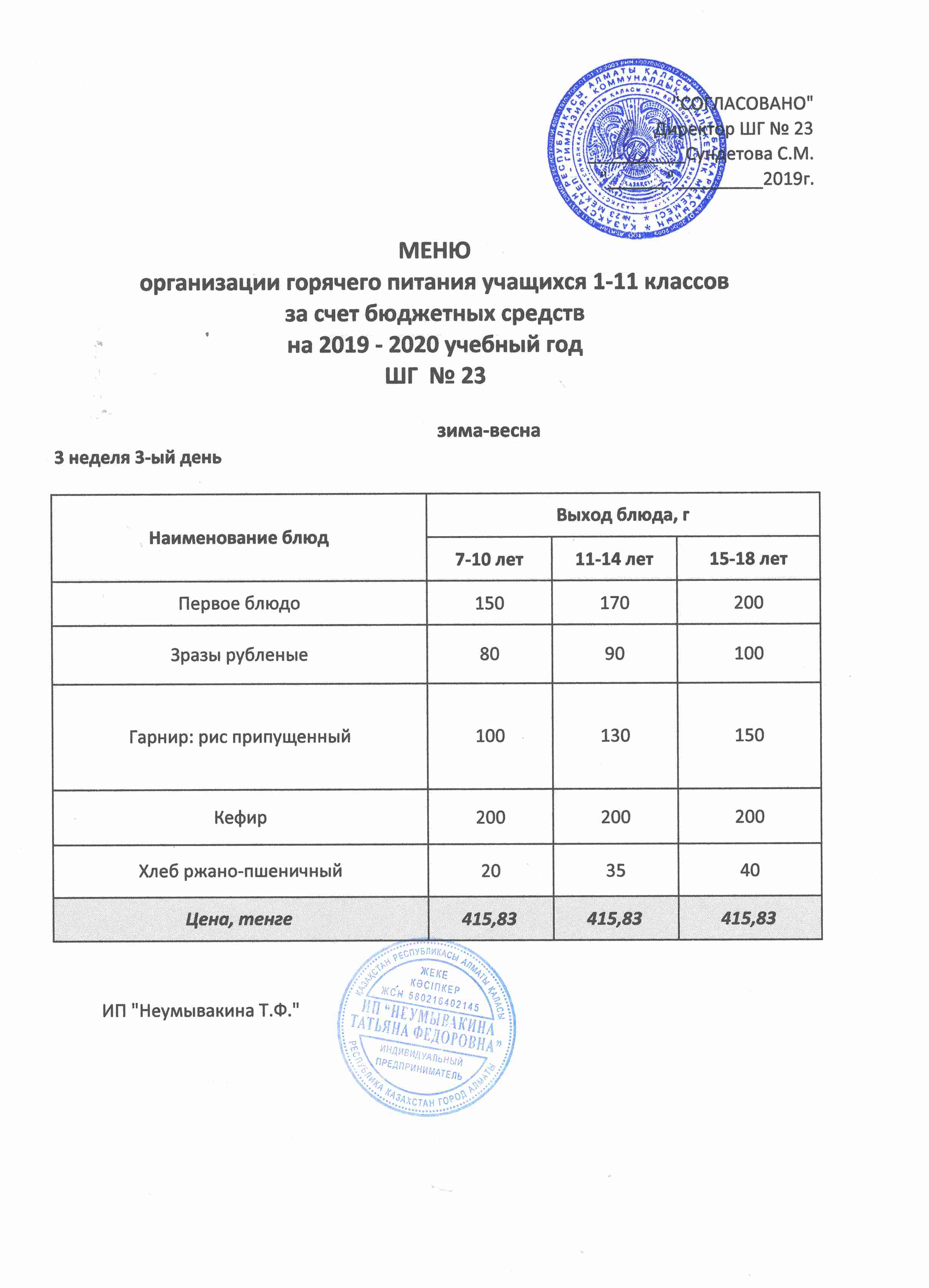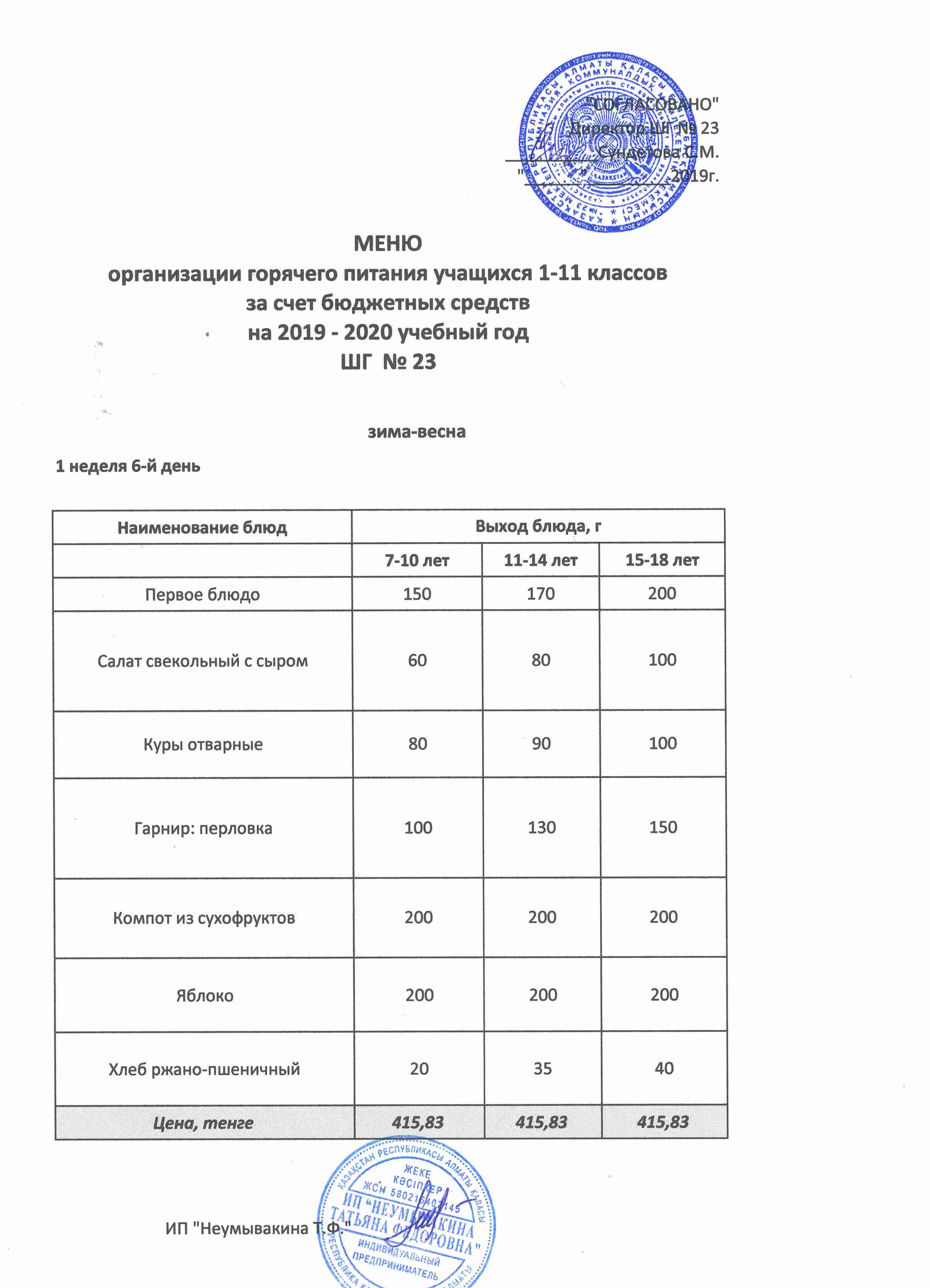 Меню организации горячего питания учащихся 1-11 классов за счет бюджетных средств на 2019 учебный год