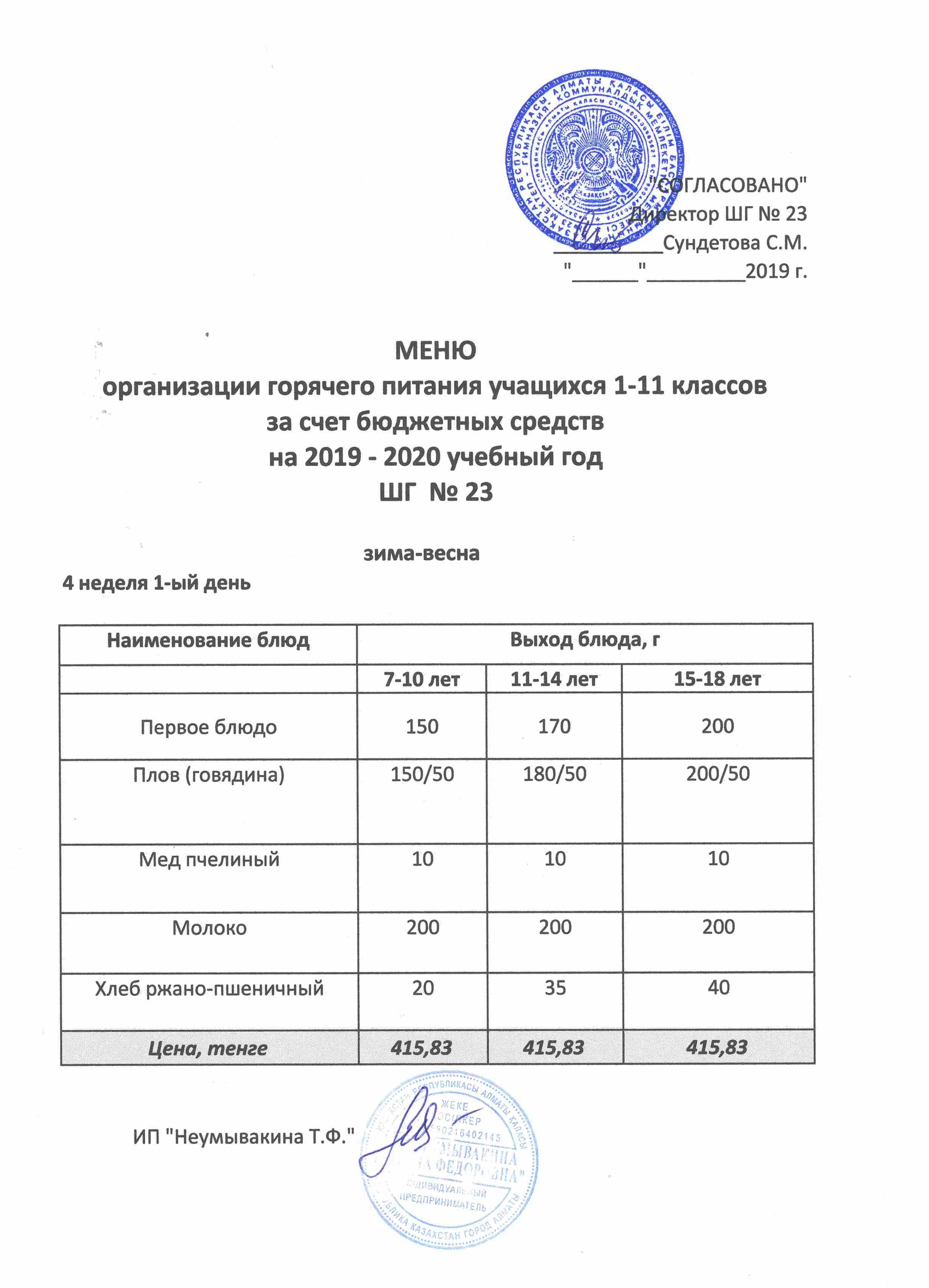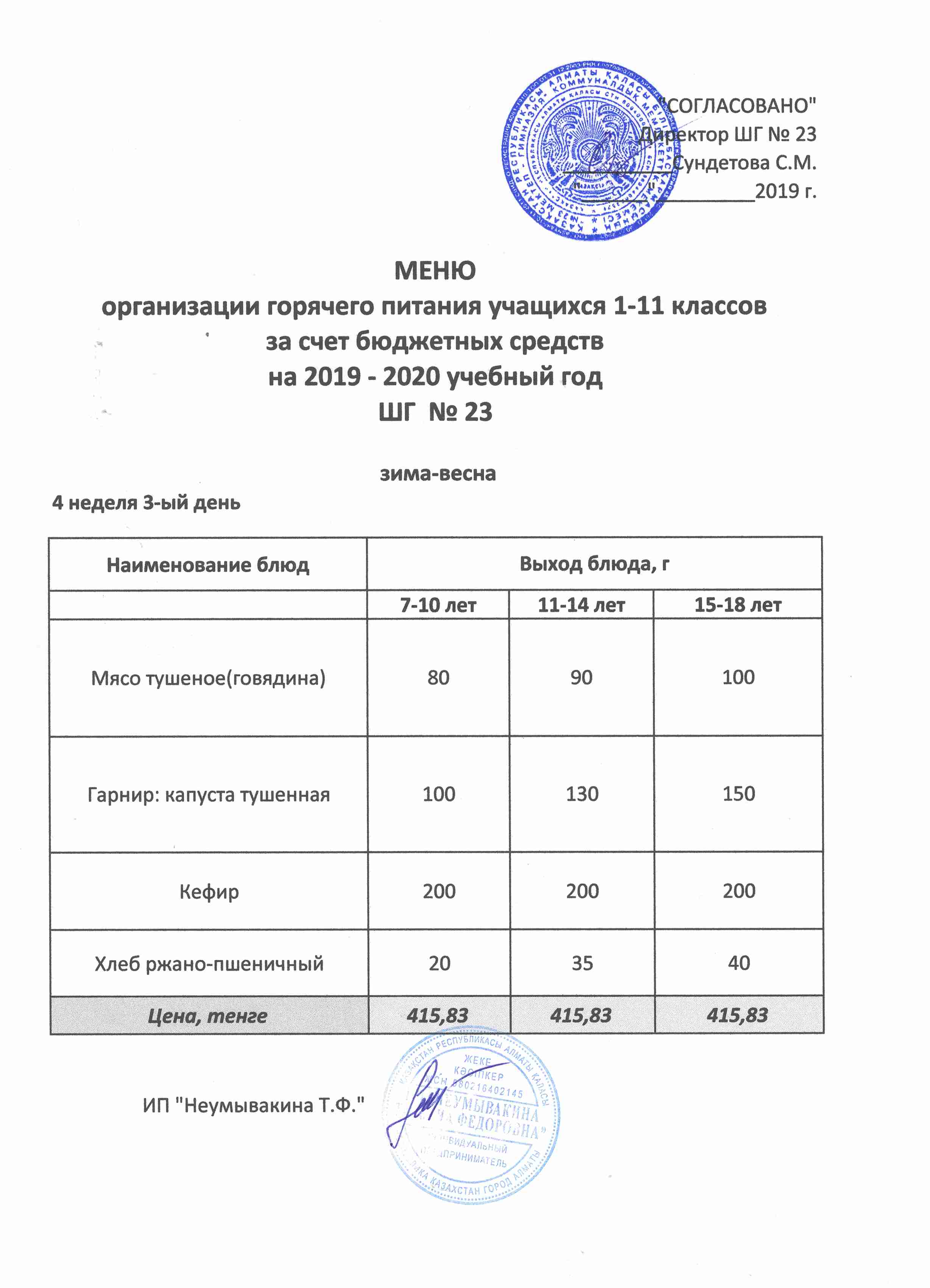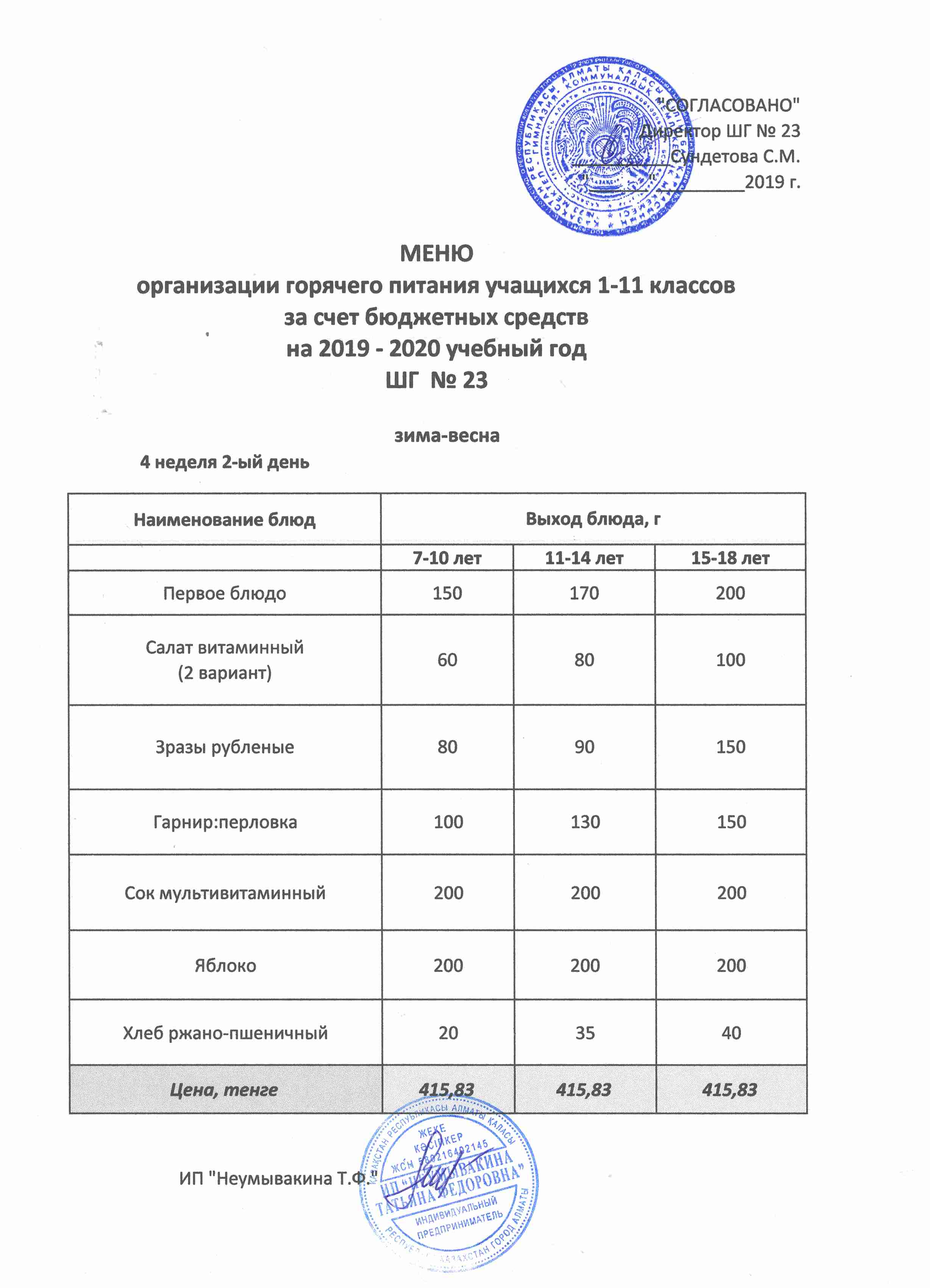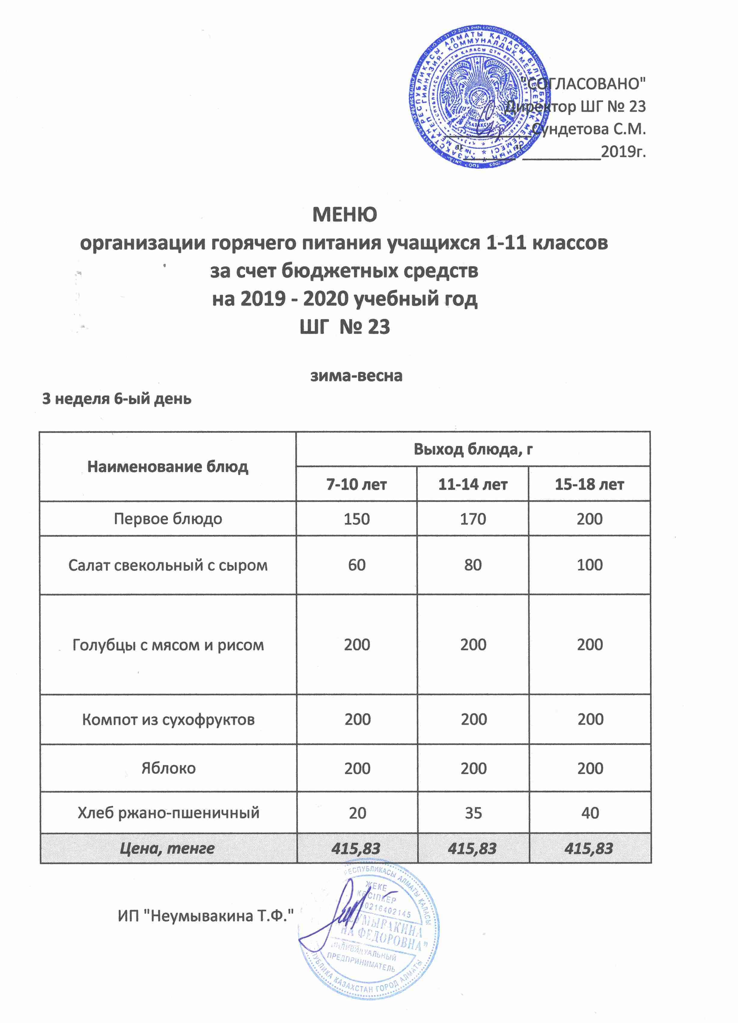 Меню организации горячего питания учащихся 1-11 классов за счет бюджетных средств на 2019 учебный год