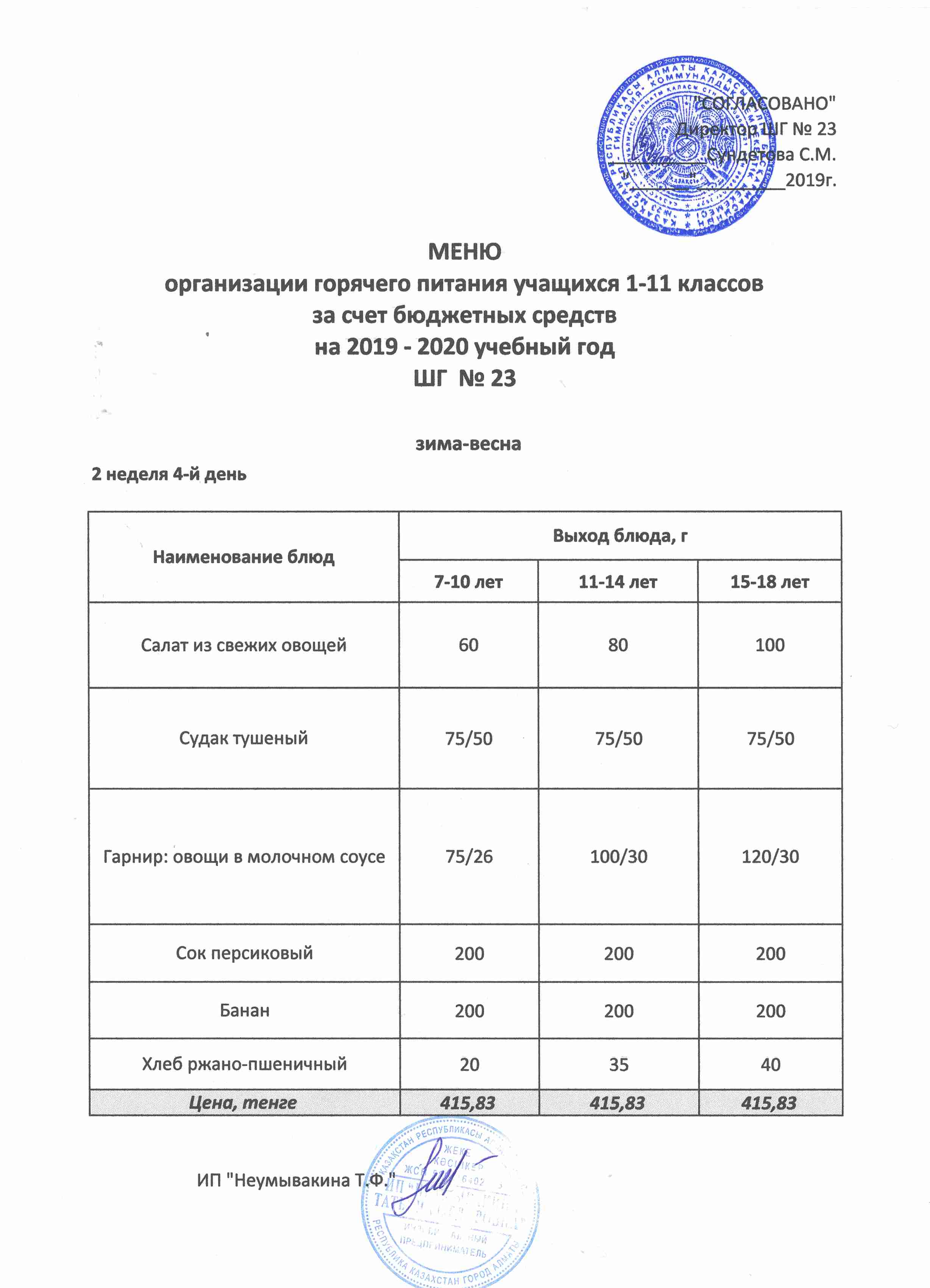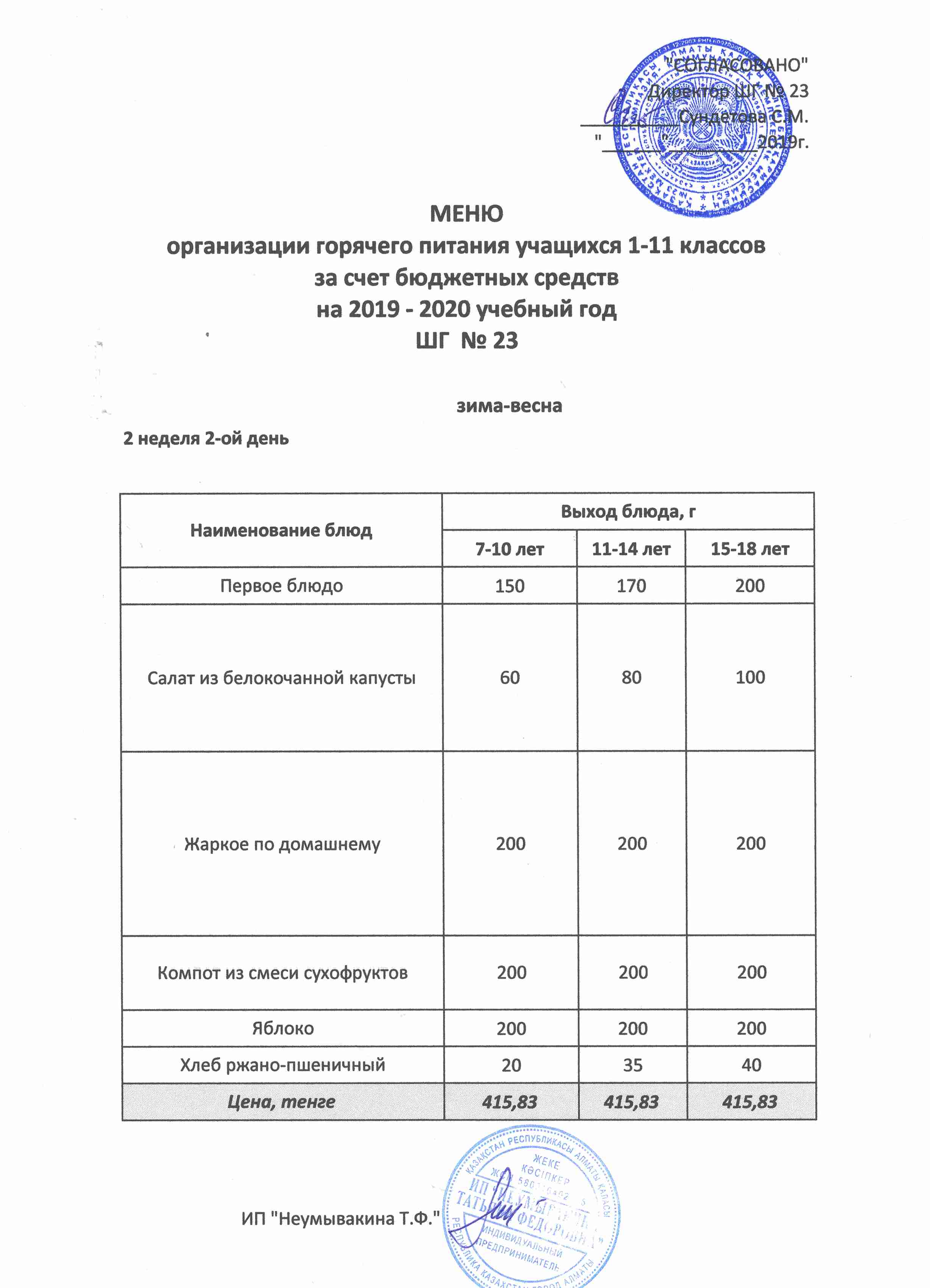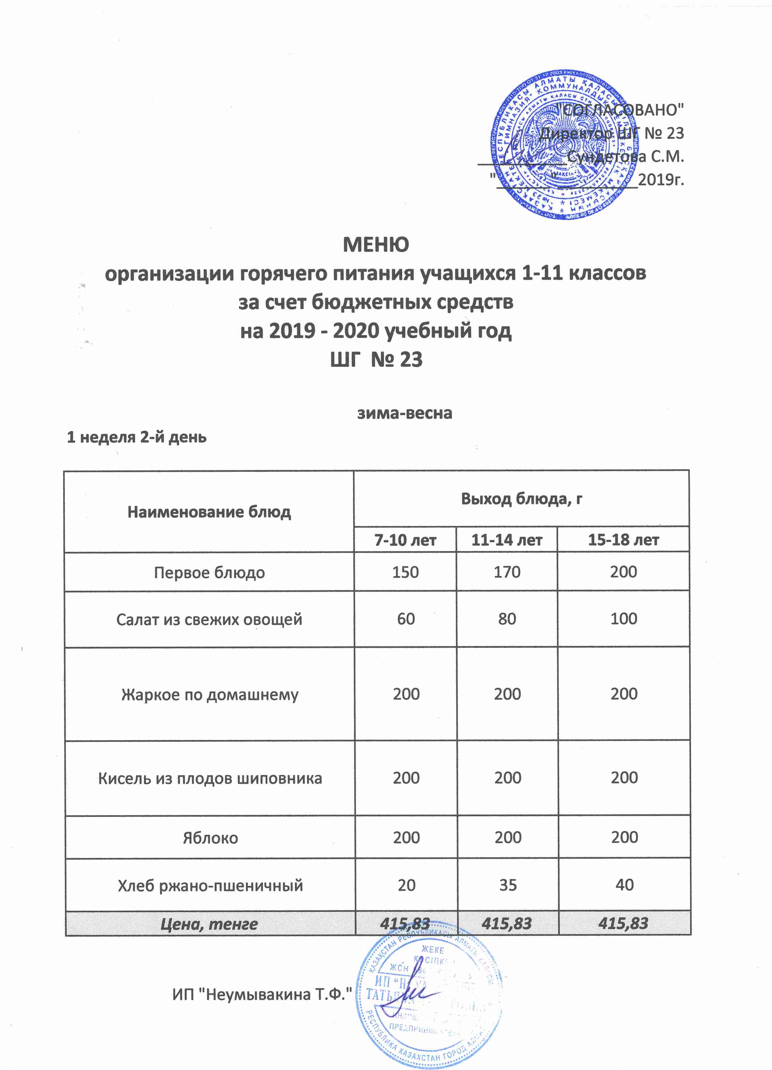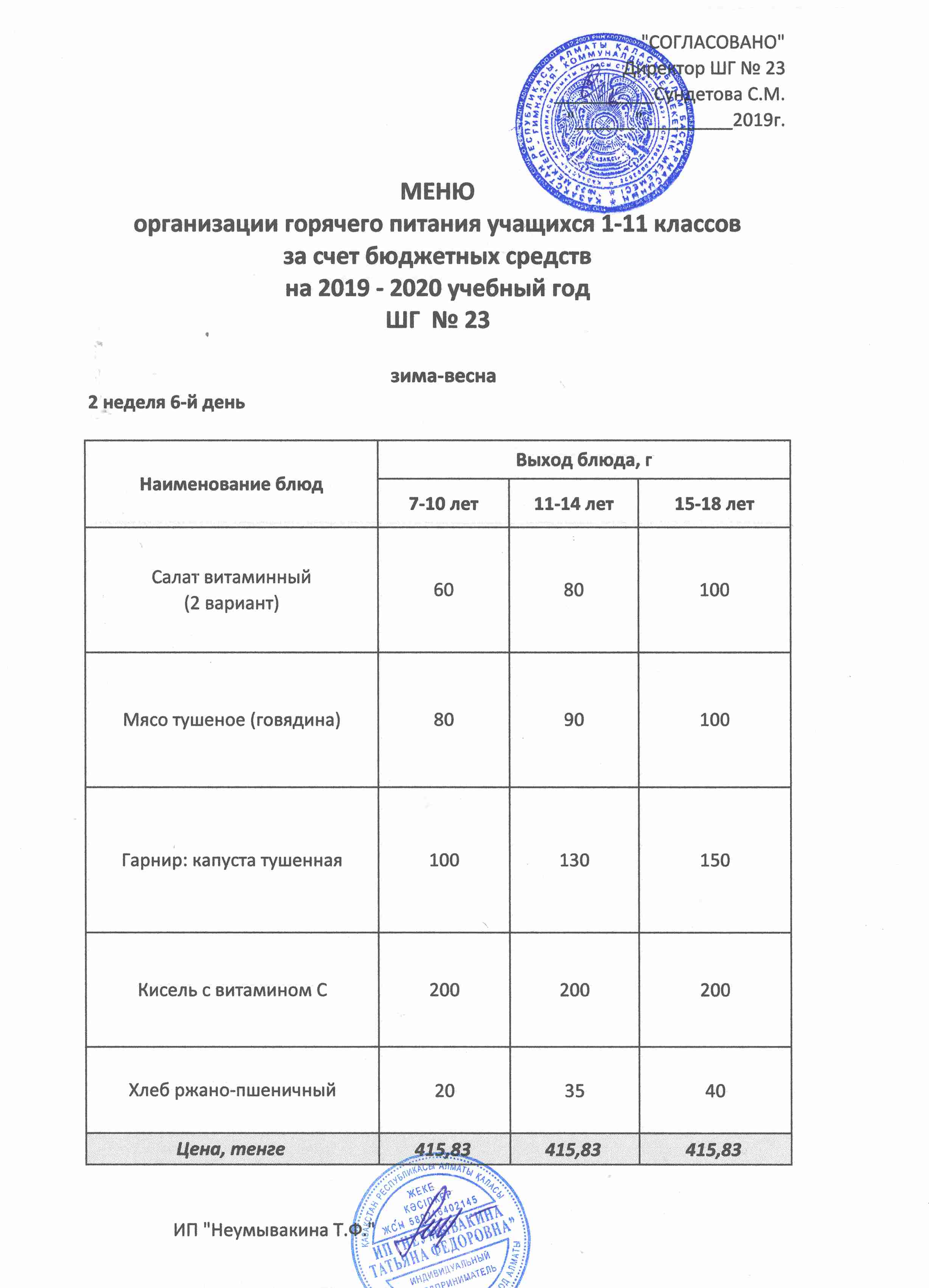 Меню организации горячего питания учащихся 1-11 классов за счет бюджетных средств на 2019 учебный год